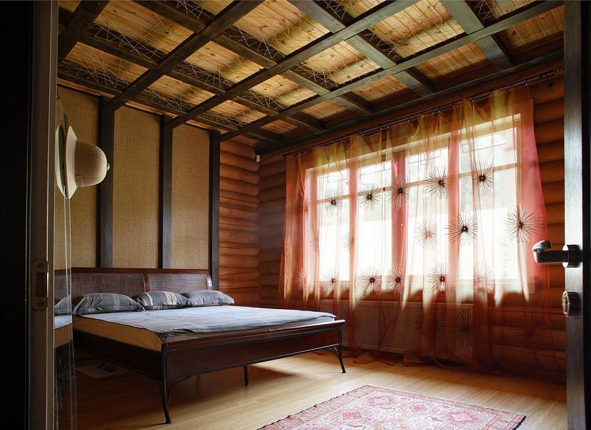 Потолок в спальне с бревенчатыми стенами может быть обшит вагонкой «блок-хаус», которая подчеркнет рельефность поверхностей.