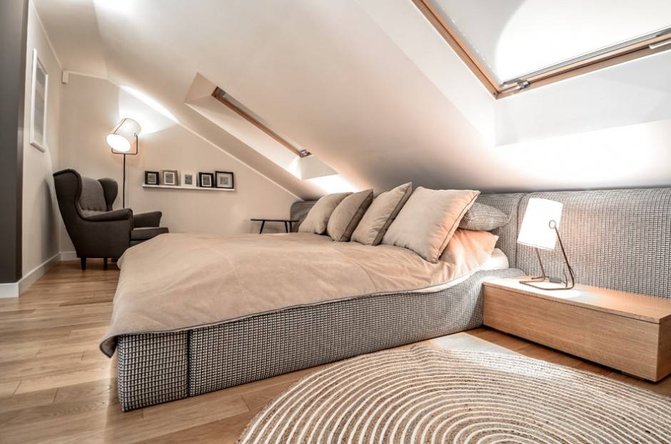 На мансардном этаже можно оставлять нетронутыми балки, это поможет создать уют в помещении и сделать его более просторным.
