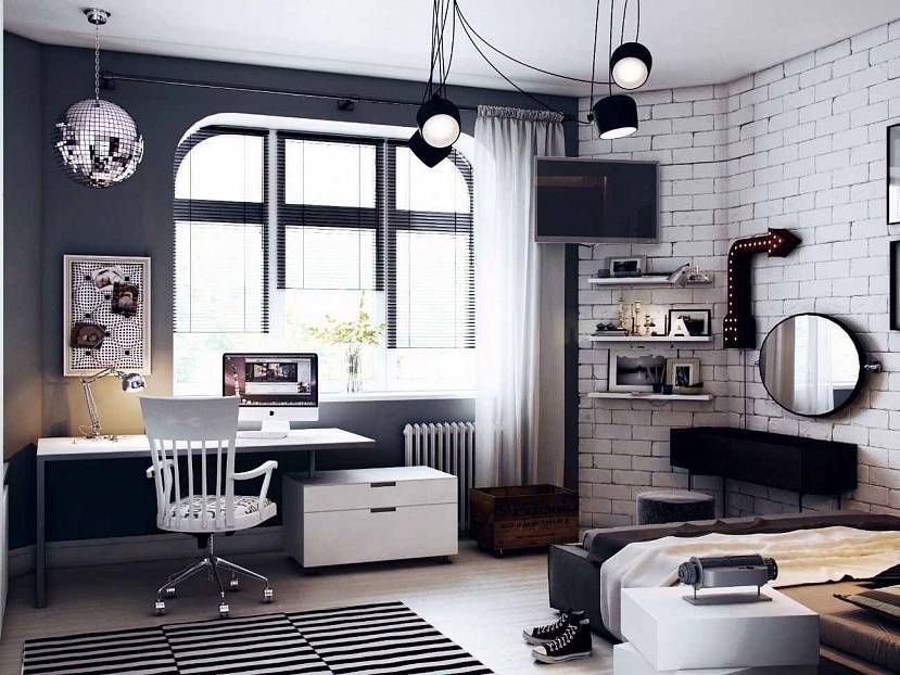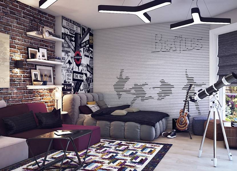 Лофт. Считается «взрослым» стилем и подходит только для спальни подростка. Для интерьера характерно царство серых оттенков и фактур: бетонные поверхности (или со стилизацией под бетон), металл светильников и глянец промышленного декора. Дополняет палитру белый, черный, оттенки коричневого; цветовые нюансы могут быть любыми.
