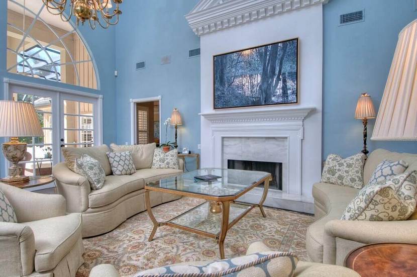 Если говорить о гостиной, то голубые стены в интерьере лучше реализовывать при помощи обоев или веницианской штукатурки.