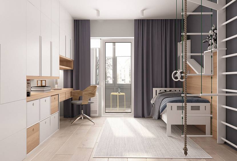 Скандинавский. Стиль подходит для комнат со скромной квадратурой и недостатком естественного освещения. Его отличительная черта — использование светло-серых оттенков в сочетании с доминантным белым и дополнительными яркими вкраплениями. В комнату для мальчика выбирают текстиль насыщенных тонов: коричневый ковер, узорчатые бело-голуюые шторы, синий плед. Детская в желто серых тонах чаще оформляется для девочки.