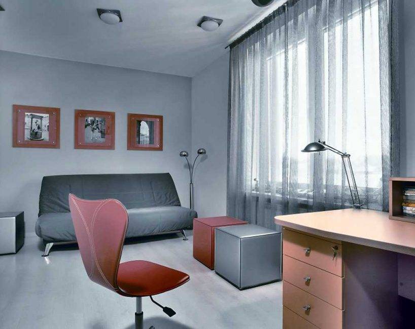 Серый незаменим в кабинетах. Деловая атмосфера будет обеспечена. Если соединить серый с коричневым, то комната приобретает торжественный вид. Выбирайте дымчатые, стальные оттенки обеспечивающие ощущение зрелости.