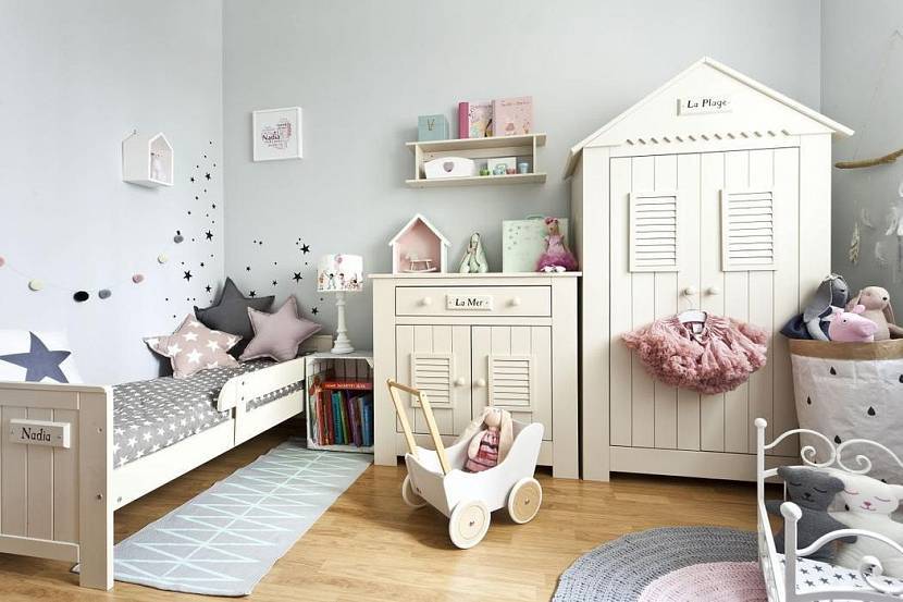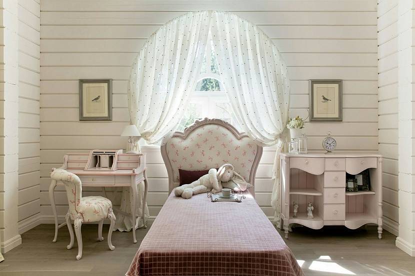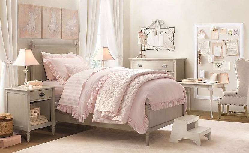 Прованс. Детская в серо розовых тонах — интерьер, который придется по душе девочкам, как малышкам, так и подросткам. В дополнение к розовому привлекается светло-желтый, горчичный, мятный, песочный, лавандовый цвет. Вместо белого используют бежевый или молочный тон; винтажную обстановку дополняет выбеленная мебель, легкие шторы и цветочные принты на текстиле.