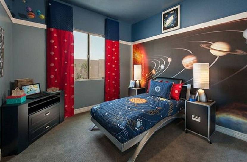 Тематический интерьер. Очень часто дизайн спальни не укладывается в существующие стили, а строится на основе какой-либо детской темы (про волшебников, принцесс, героев сказок или мультиков). В комнате мальчика используется тема автогонок, футбола, супергероя; такая детская в серо голубых тонах, как правило, дополняется красным, оранжевым, синим декором.