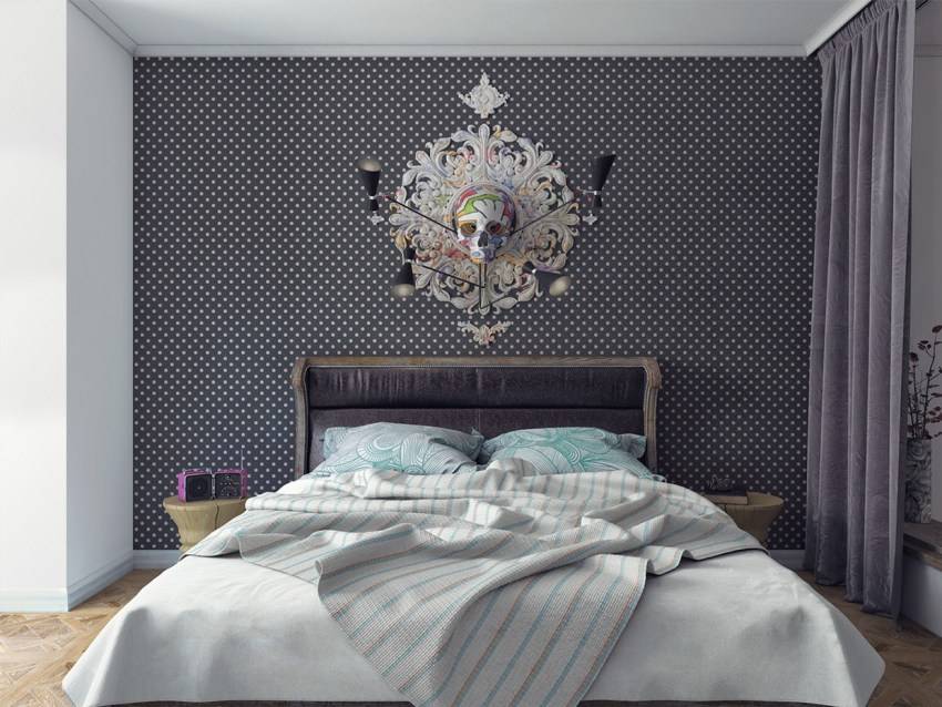 Для просторной спальни можно выбрать покрытия с крупными орнаментами и рисунками: например, серые обои с цветами, линиями, геометрическими фигурами, классическими принтами или абстрактными изображениями. В современных интерьерах будут смотреться эффектно реалистичные фотообои серого цвета.