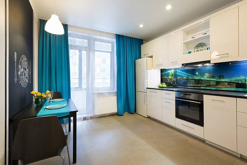 Синие шторы на кухнеИсточник berkem.ru/