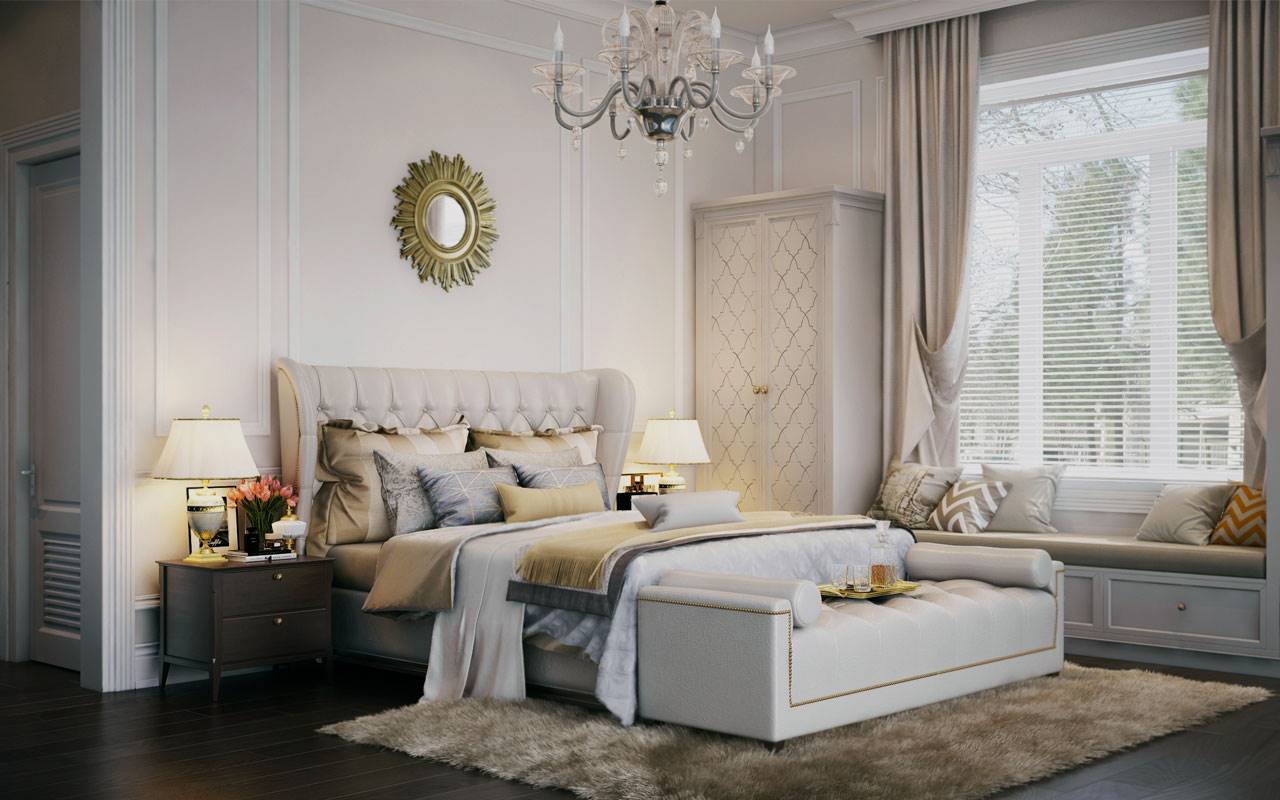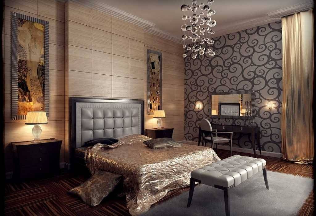 Этот стиль считается максимально приспособленным к комнате отдыха. Строгие формы мебели, интересные, но сдержанные украшения хорошо впишутся в интерьер. Тумбочки, комоды и шкафчики стараются приобретать из натурального дерева. Они могут иметь округлые формы без присутствия острых углов. Стены спальни в зоне изголовья кровати стараются отделывать обоями с имитацией шелка и другого богатого текстиля. По обеим сторонам располагают ночники. Одну из длинных стен в комнате можно полностью заставить мебелью.