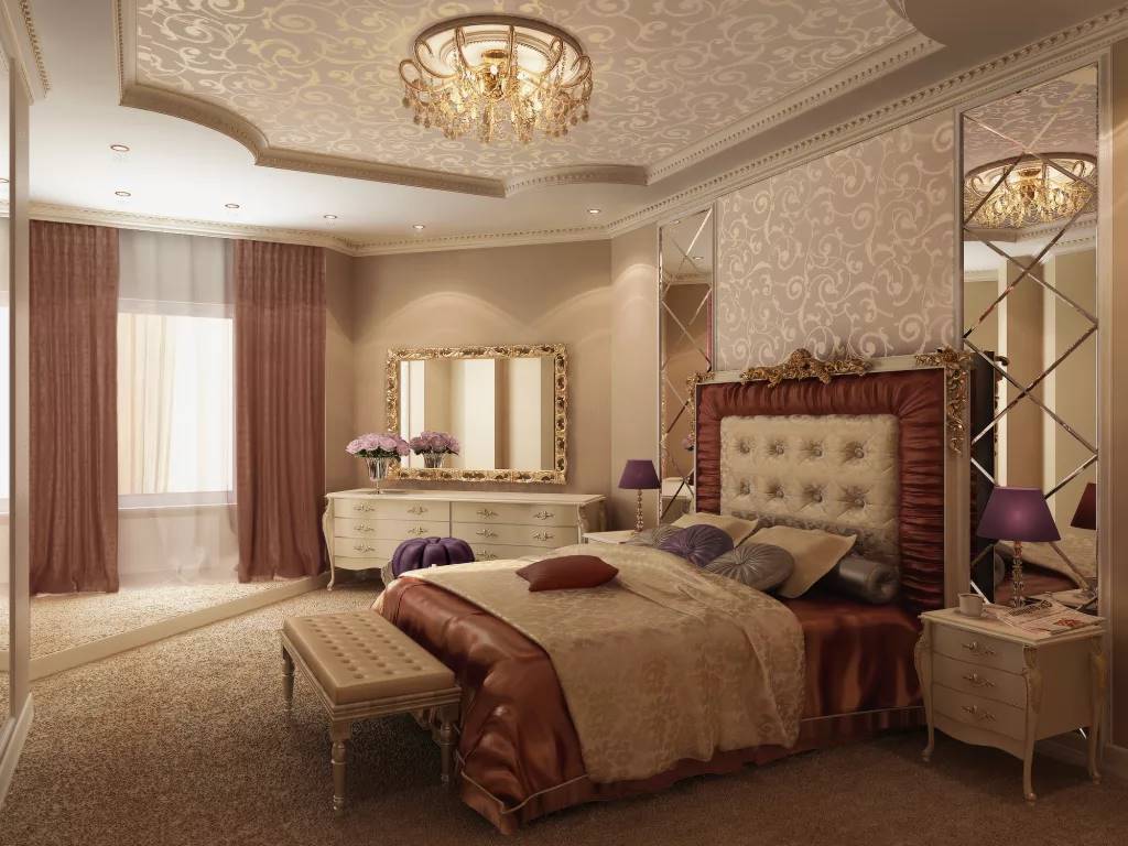Царское ложе с внушительным изголовьем и роскошным пастельным бельем должна притягивать внимание. Множество зеркал сделают комнату просторнее и светлее, а торшеры и бра усилят этот эффект
