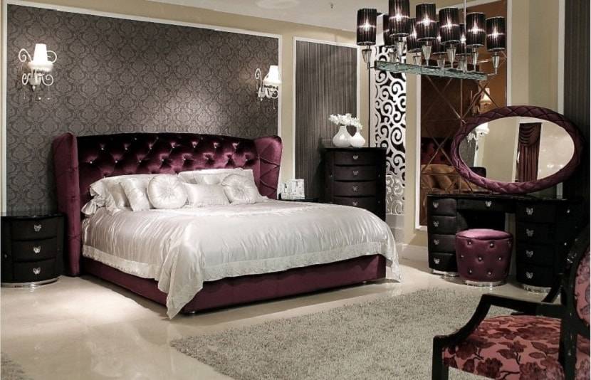 На первом месте и выбор кровати. Не нужно забывать о роскоши стиля, поэтому выбирается огромная конструкция и обязательно с высокой спинкой. Она выполняет роль дополнительного декора. Для этого ее нередко оформляют в капитоне (каретная стяжка).