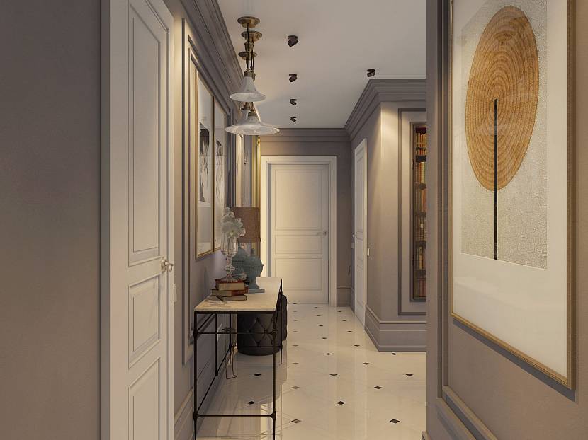 Резьба, колонны и лепнина помогут дополнить однотонное оформление. Также, в качестве декора можно использовать натуральные материалы, зеркала, роскошные настенные светильники, которые будут сочетаться с основными осветительными приборами в коридоре.