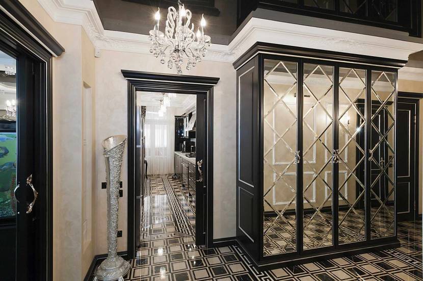 В представленном варианте стены покрашены бежевой краской, для отделки пола использовали черно-белую плитку с изображением квадратов. Зеркальные дверцы шкафа увеличивают пространство и, отражая поток света, создают интересные переливы. Для украшения прихожей повесили роскошную люстру и установили декоративную вазу в углу.