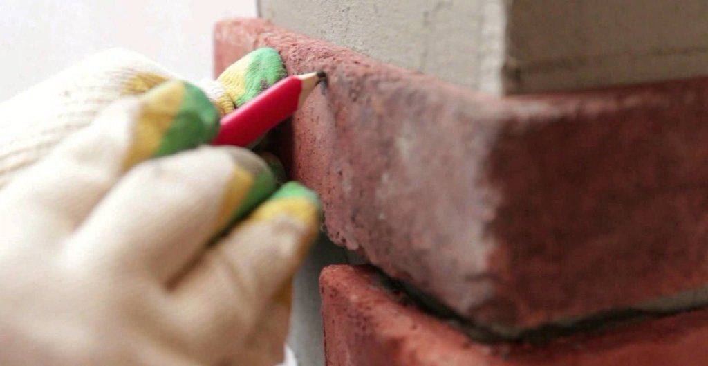 Края кладки будут смотреться привлекательнее, если плитки красиво обрезать. Поверхность декоративного камня имеет четкую фактуру, что облегчает обрезку крайних фрагментов. Пилить ножовкой следует прямо по линиям контуров, чтобы срезы получились наиболее естественными. Все спилы обязательно шлифуют наждачной бумагой.