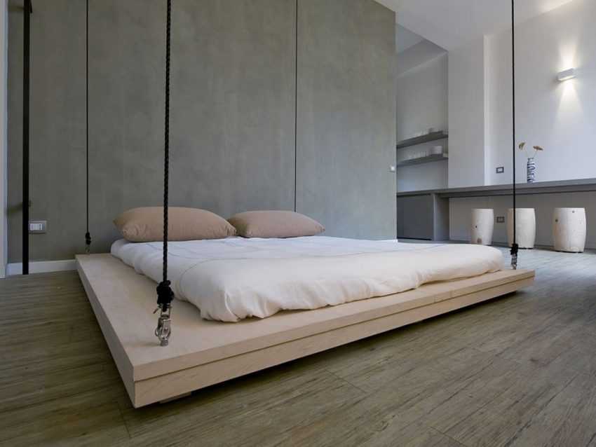 Так в спальне часто устанавливают низкие кровати на подиуме, при этом важно, чтобы она также как и другие предметы функциональной мебели сливалась по цвету со стенами. Выбирается не громоздкая, а легкая на вид мебель без резьбы и узоров