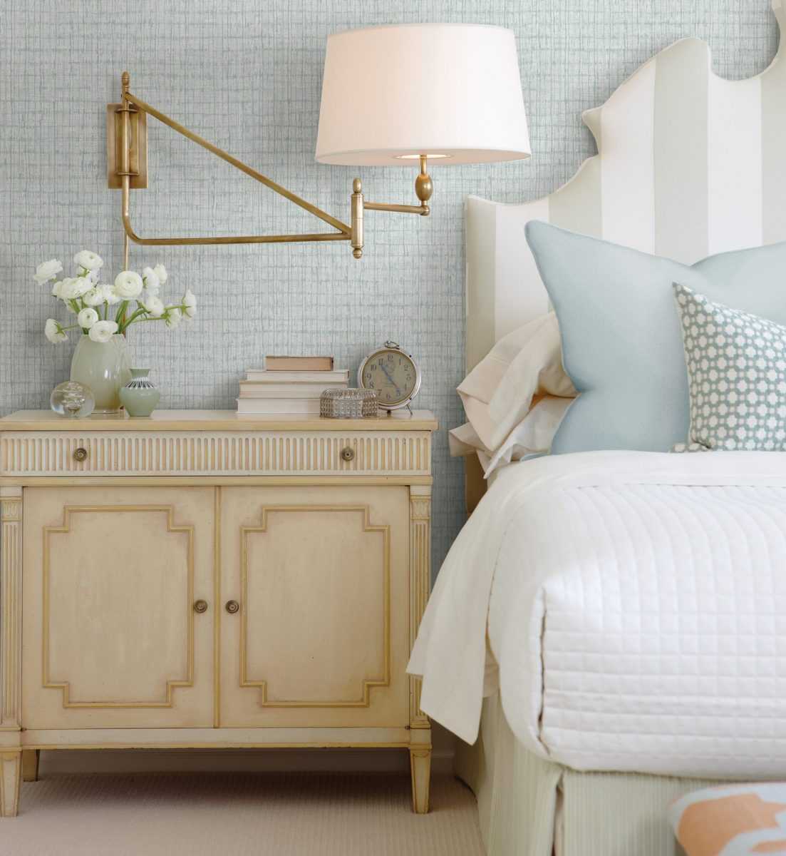 Постельное белье должно вписываться в общую композицию: стоит подобрать комплект в спокойных, природных оттенках или с мелким цветочным принтом.
