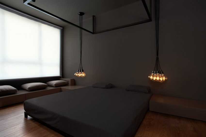 Основа выкрашена, как правило, в темный цвет, по размеру она прилично шире и длиннее, чем уложенный на нее матрас. Еще одна характерная черта — отсутствие изголовья. Но далеко не всем такой вариант подходит. На фото внизу представлена идея: как выйти из положения, сделать изголовье и не сильно нарушить стилистику.
