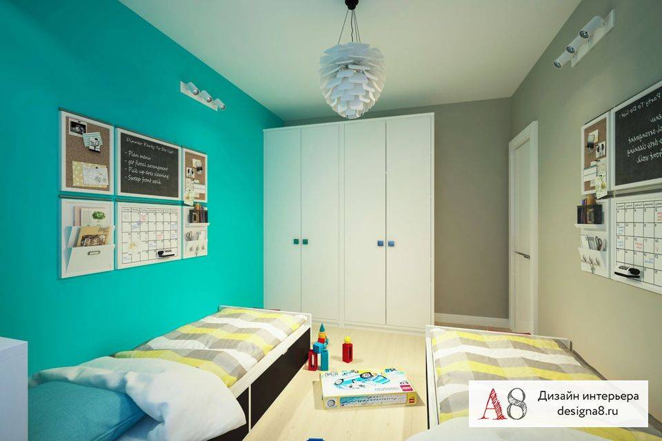 Напротив входа поставили отдельно стоящий шкаф. В дальнейшем, когда дети подрастут, его можно поменять на более функциональную мебель.
