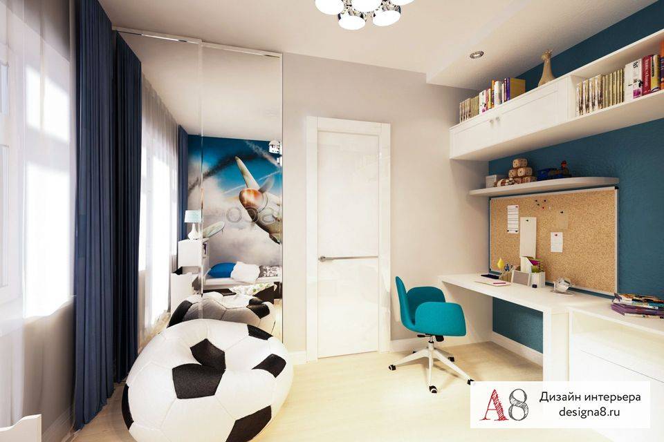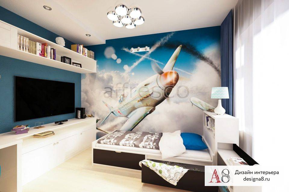 Мальчику, владельцу комнаты, очень нравятся самолеты. Поэтому стену за кроватью подчеркнули фотообоями самолетной тематики. Изображение для печати хозяин комнаты выбирал самостоятельно.