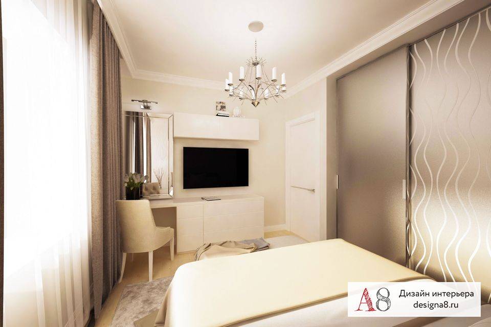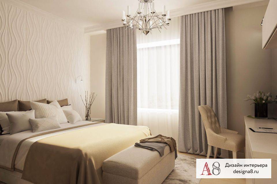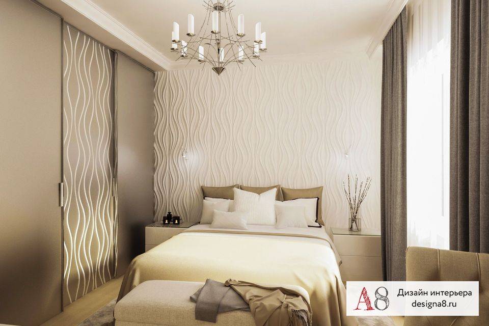 Дизайн в спальне оформили в светлых и бежевых тонах. В одном из проектов портфолио студии «А8» заказчики увидели 3D-панно и шкаф с молочным окисленным стеклом. Клиенты попросили повторить эти решения в собственном интерьере.