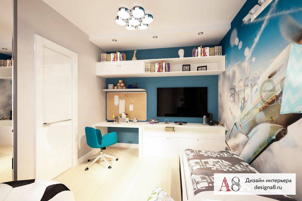 Простенок за рабочей и ТВ-зоной выкрасили в синий. Цвет выбрали из палитры оттенков на фотообоях.