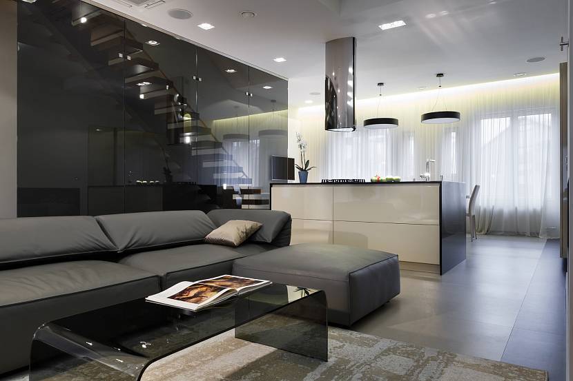Размещаемая на нижнем этаже общественная зона, как правило, планируется в виде студии, что делает пространство просторным и насыщенным светом. Однако необходимость зонировать помещение все же сохраняется. Какие приемы помогут сделать это?