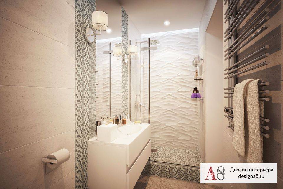 - 3D-декором в форме волны Venis Ona Beige. Им выложили стену в душевой кабине и за туалетной инсталляцией;