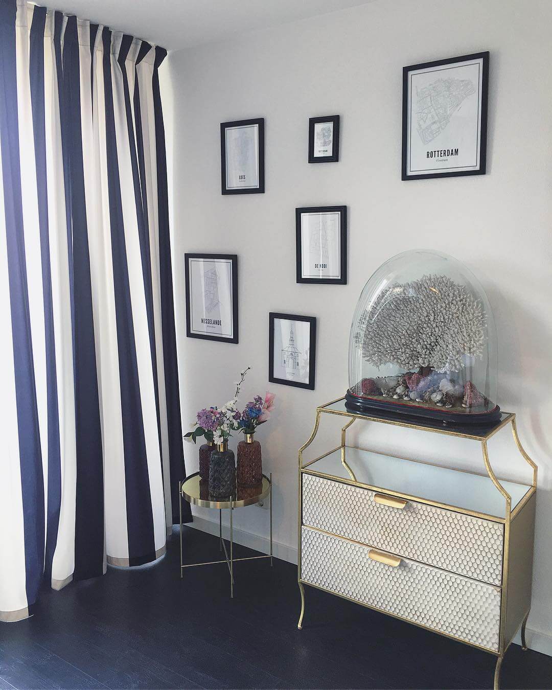 Контраст стен и пола, двухцветные шторы в вертикальную полоску – соблюден баланс.