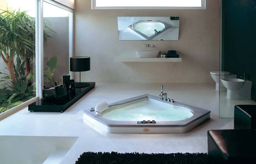 — Симметричная ванна занимает главный угол, красиво смотрится со всех сторон. На оставшемся пространстве можно расположить раковину, унитаз, стиральную машинку и несколько шкафчиков.