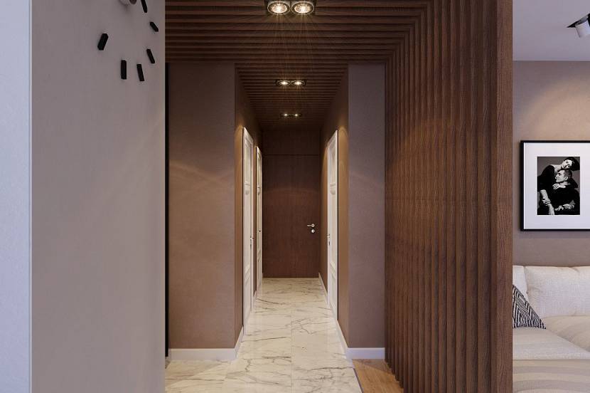 Стандартной текстурой для мебели является имитация дерева. Но это всего лишь шаблон, на самом деле текстура может быть любой и это почти не влияет на стоимость. Узкий коридор требует сокращения количества цветов и материалов, чтобы пространство не было перегружено.