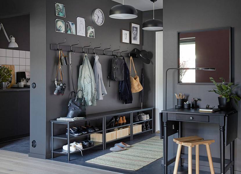 Если прихожая настолько узкая, что даже маленький шкаф в нее не поместится и на заказ делать смысла нет, используйте любые открытые формы хранения и готовые модульные решения.