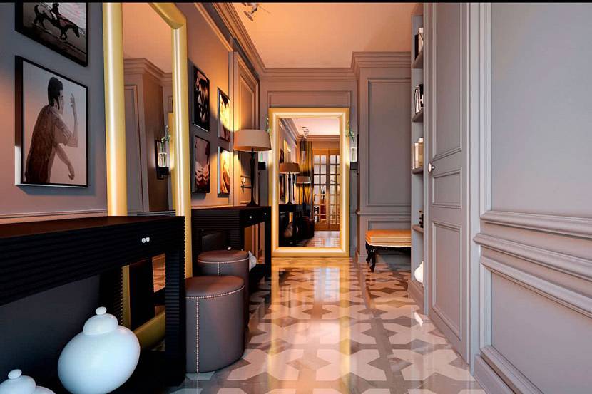 Когда оформление квартиры выдержано в духе английской классики или допускает налет античности, недостатки слишком длинного коридора легко превратить в достоинства. Анфилада арок или прямоугольных порталов – классический прием, позволяющий создать благородную перспективу.