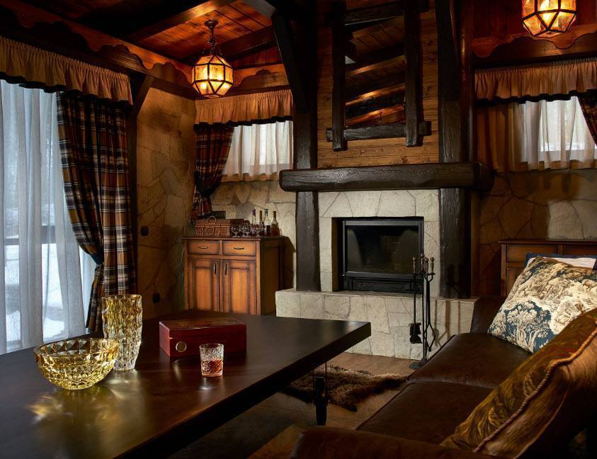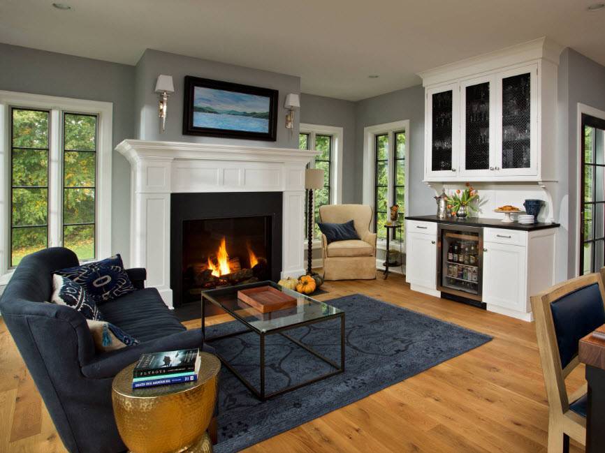 Выделение композиционного центра комнаты можно сделать освещением либо расположением на полу большого ковра либо камина. Неподалеку можно установить необычной формы столик, имеющий ажурную столешницу и витые ножки.