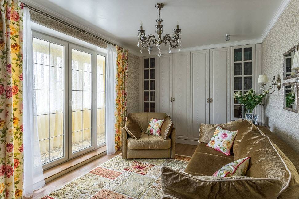 Если обои выбраны в мелкий рисунок, то занавески, а также обивку лучше подобрать однотонные. И наоборот.