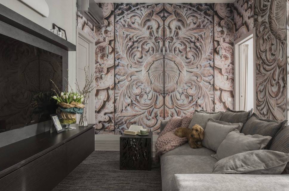В гостиной смело бери все те настенные покрытия, которые не годятся в кухне или в прихожей. Например, это бумажные или текстильные обои – сочетание натуральной фактуры с витиеватыми рисунками