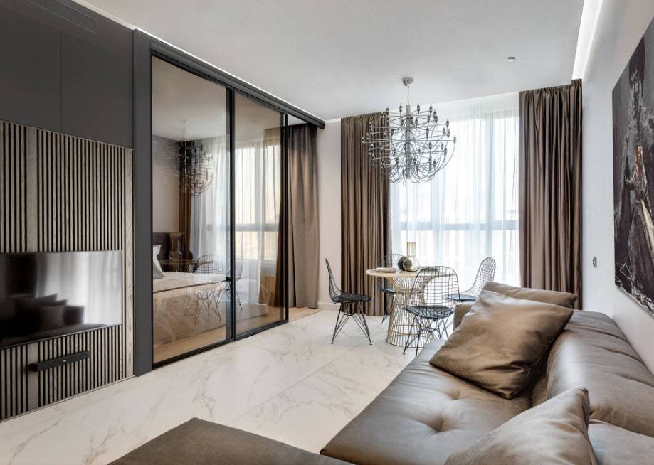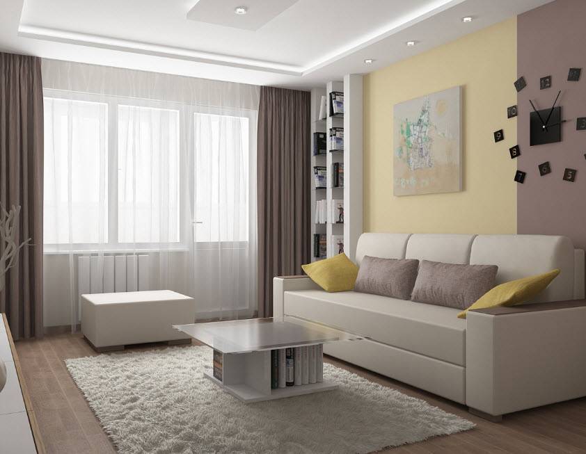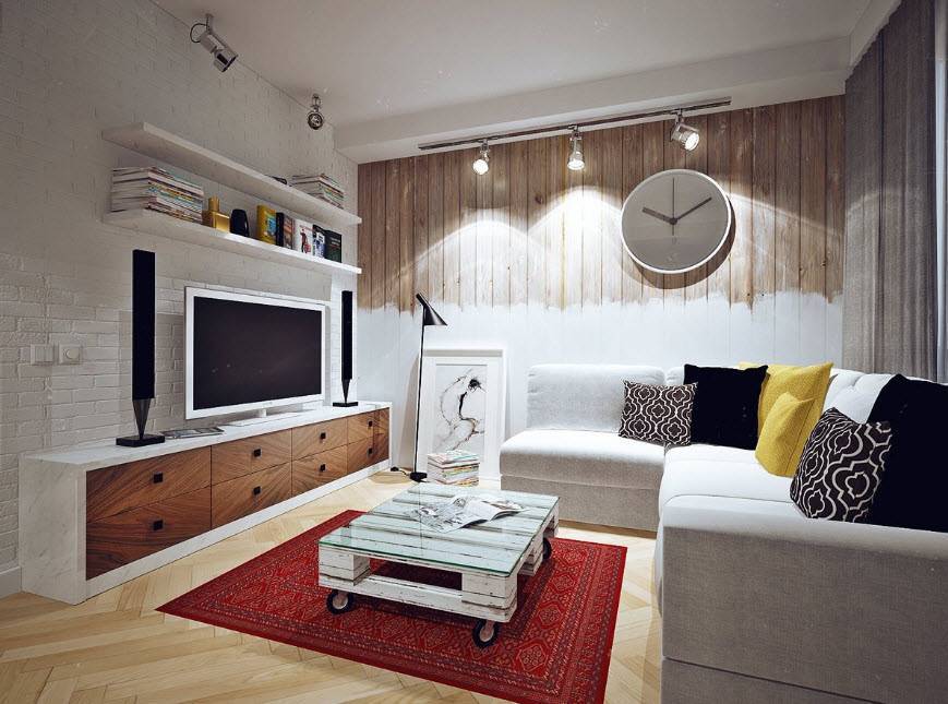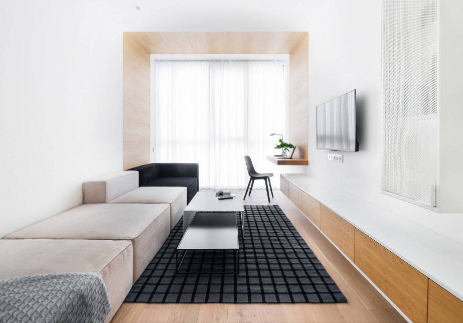 Наиболее правильным решением для малогабаритной гостиной станет оформление в минималистическом направлении, предпочитающем строгость и свободу пространства. В таком исполнении, простой и, в то же время, изящный интерьер наполнится монохромной цветовой гаммой, обилием света и минимальным количеством мебели, декора.