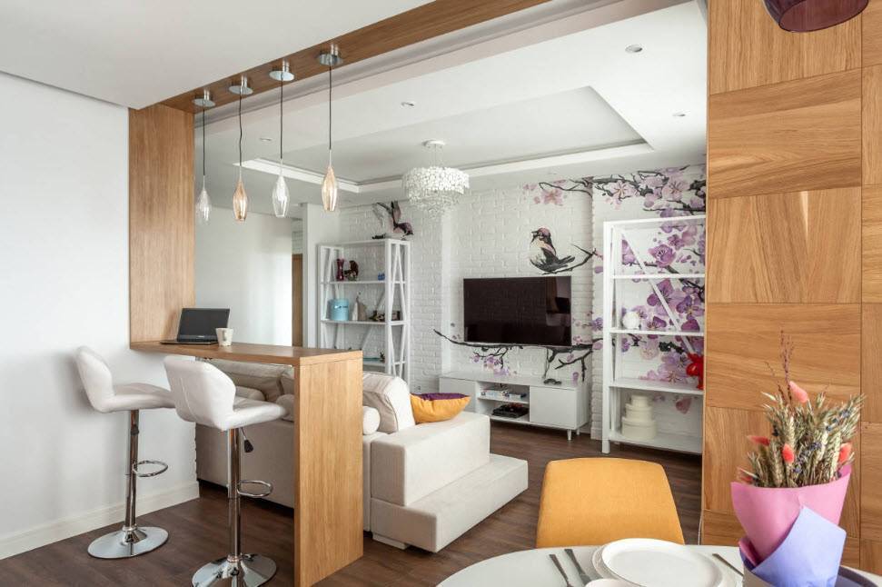 Одной из главных тенденций 2020 года является большое количество света в гостиной. Для этого все чаще устанавливают панорамные окна. Благодаря этому помещение кажется визуально больше. Кроме того, в этой части комнаты можно устраивать вечернее чаепитие с красивым видом на город. Безусловно, небольшие помещения меньше остальных подходят для творческих экспериментов. Поэтому дизайнеры предлагают по возможности объединять гостиную с кухней. Уютные квартиры-студии буквально завоевывают популярность в 2020 году. Поскольку в них можно реализовать бесчисленное количество идей. Чего только стоят фото-примеры в галерее.