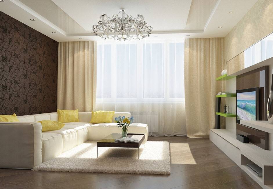 Начинать создавать такой, как на фото интерьер узкой гостиной, рекомендуется с отделки потолка. Лучше, если он будет ослепительно белым – глянцевым или матовым, без разницы. Это может быть: