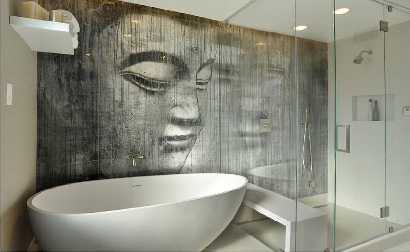 Интересный способ придать ванной комнате характер — покрыть чашу для купания различными отделочными материалами: деревом, плиткой, имитирующей натуральное сырье, такое как камень, шпон или бетон. Как правило, выбор падает на керамическую плитку, поверхность которой легко моется, устойчива к влаге и частому контакту с водой, а также не создает проблем при эксплуатации