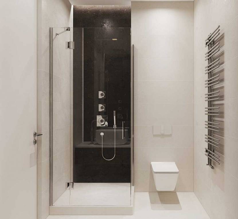 Нейтральные тона отделочных материалов и прозрачная перегородка в интерьере санузла 3 кв. м.