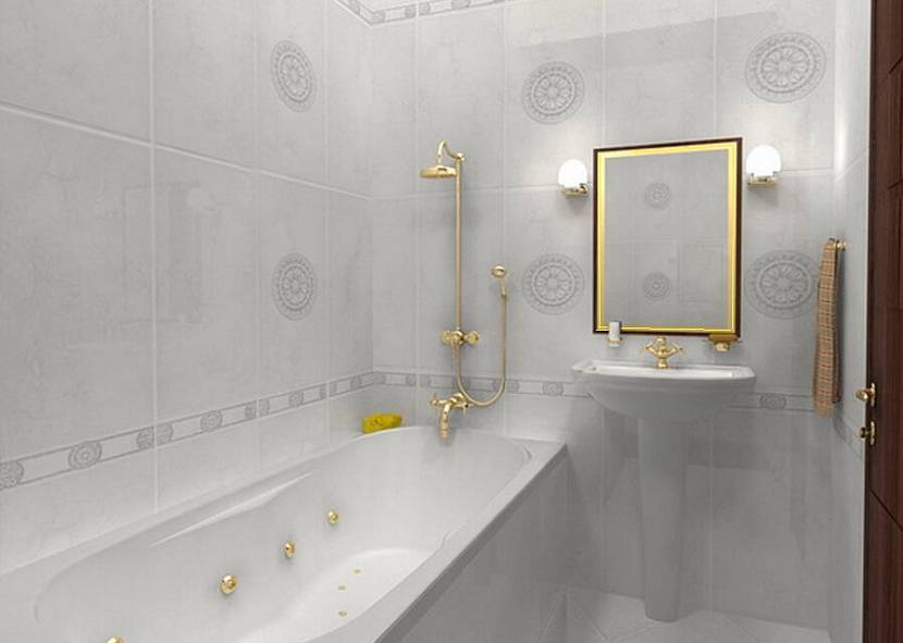 Белый интерьер смотрится опрятно и аккуратно, разбавить однообразие можно еле заметным рисунком на плитке, обрамлением зеркала и кранами золотого оттенка.