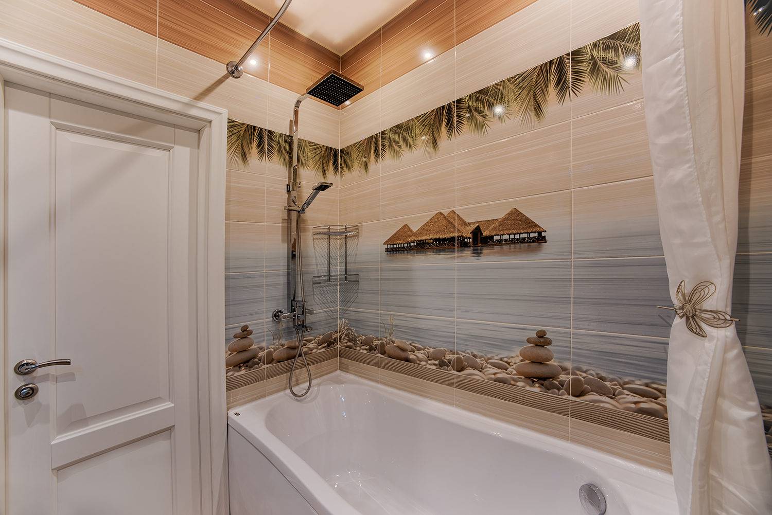 Наиболее простой вариант для отделки это керамическая плитка. Это прочный, практичный и экологически чистый материал. За счет разнообразия цветов и фактур плитка подходит под любой дизайн интерьера. Существуют однотонные расцветки, а также варианты с рисунками, орнаментами, зеркальной поверхностью, перламутром, имитацией мозаики или витража. Плитка отличается и формой, это не только прямоугольники или квадраты, но и круги, восьмиугольники и пр.