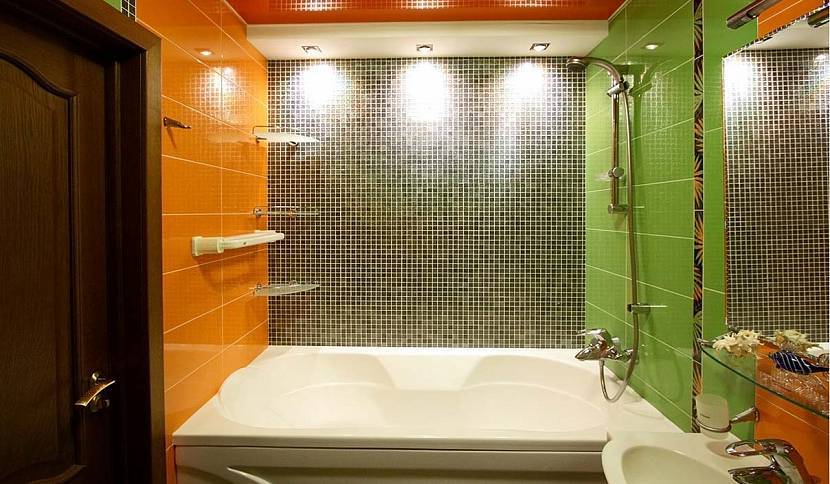 - Не стоит использовать громоздкие люстры. Лучше разместить по всему периметру ванной комнаты точечные светильники или светодиодную ленту.