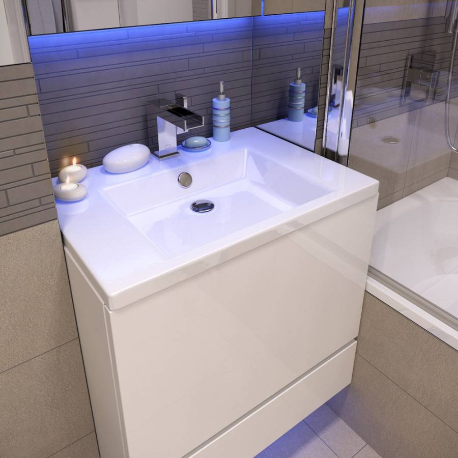 Если убрать часть предметов под столешницу с раковиной, ее уровень станет выше, однако такая планировка способствует размещению дополнительной мебели.