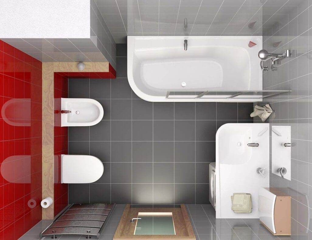 Как уже было сказано, место не позволит фантазии сильно разгуляться. Необходимо определиться с количеством важных элементов ванной комнаты. От наличия лишних элементов зависит рационализация комнаты. Задумайтесь, чтобы некоторые предметы (стиральную машинку, бельевую корзину) перенести в другие комнаты, где пространство позволяет это сделать. Отличное решение для данного примера — кухня, это поможет «разгрузить» место в ванной. Правильным будет объединить ванную с туалетом. Это сэкономит место (не придётся делать дополнительную стену) и деньги. Решение правильное для небольшой семьи. Для семьи, насчитывающей от четырёх человек, лучше подходит раздельный санузел. Параллельно увеличьте ванную за счёт коридора, если планировка позволяет. Коридор используют достаточно редко. Не жалейте его.