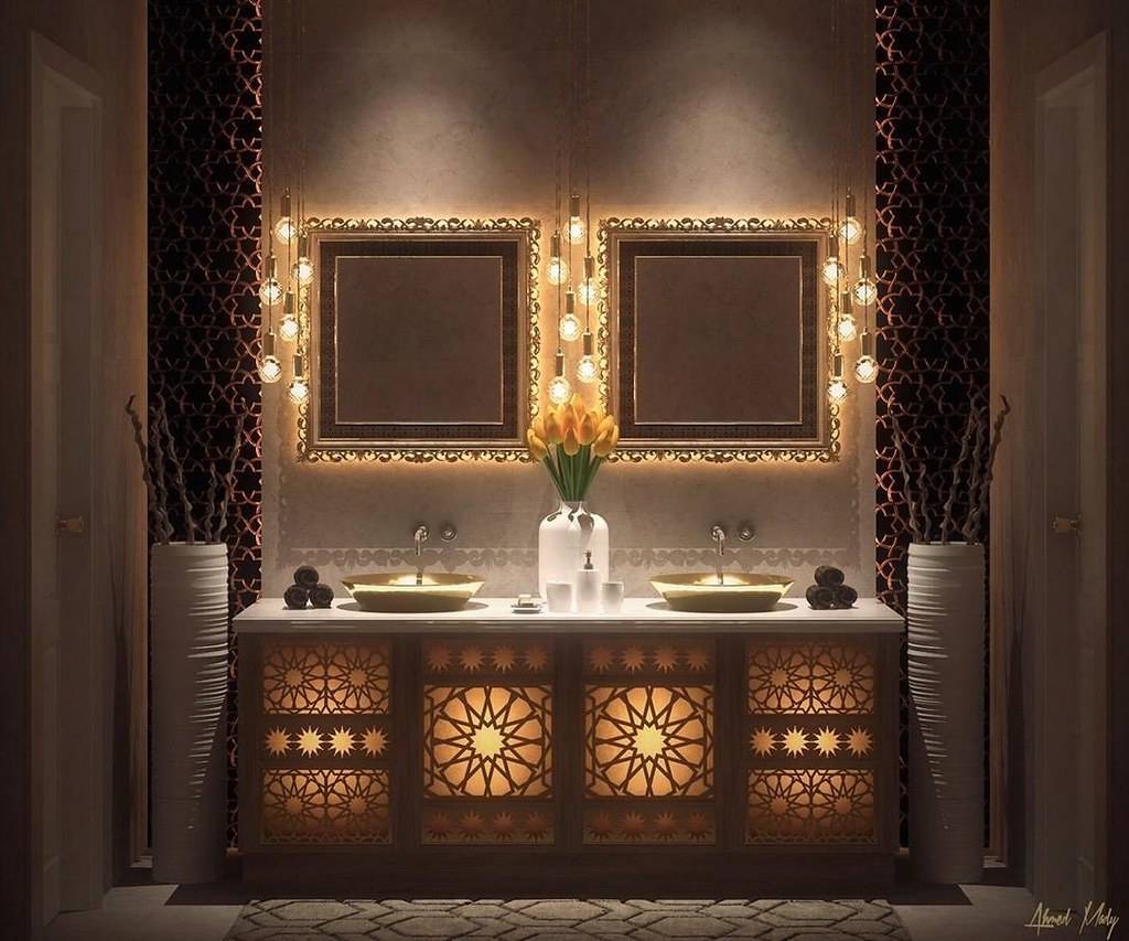 Зеркала в позолоченных рамах или окаймленные мозаичной плиткой служат дополнительным украшением интерьера ванной комнаты. Из нескольких зеркал можно составить интересную стилистическую композицию. Поддерживают восточную атмосферу кувшин из патинированной латуни с тонким длинным горлышком и керамическая ваза на кованной подставке, расписанная этническим орнаментом. Также в марокканском интерьере должно найтись место канделябрам из бронзы или чеканного серебра.
