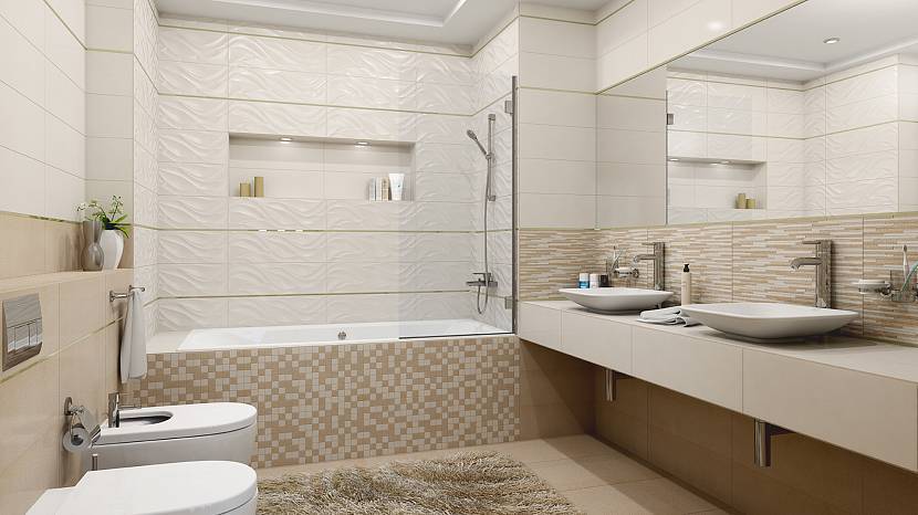 Здесь при укладке кафельной плитки, кроме основного фона, можно экспериментировать использование различных строительных технологий монтажа: