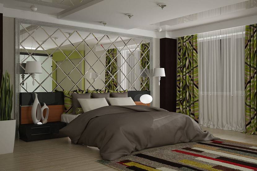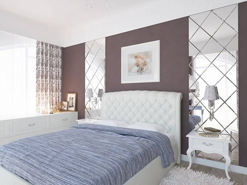 В спальне. В отличие от гостиной, дизайн в спальне, предполагающий зеркальные панели или литую пленку, прикрепленные на стену как обои, считается не только уместным, но и может привнести некоторые пикантные моменты в семейную жизнь. Однако и здесь можно проявлять больше фантазии, например, наклеить ряд стикеров в форме сердечек или сделанную на заказ большую наклейку – картину. зеркальные часы или панно. Фото декоративных элементов в дизайне спальни сегодня поистине поражают разнообразием.