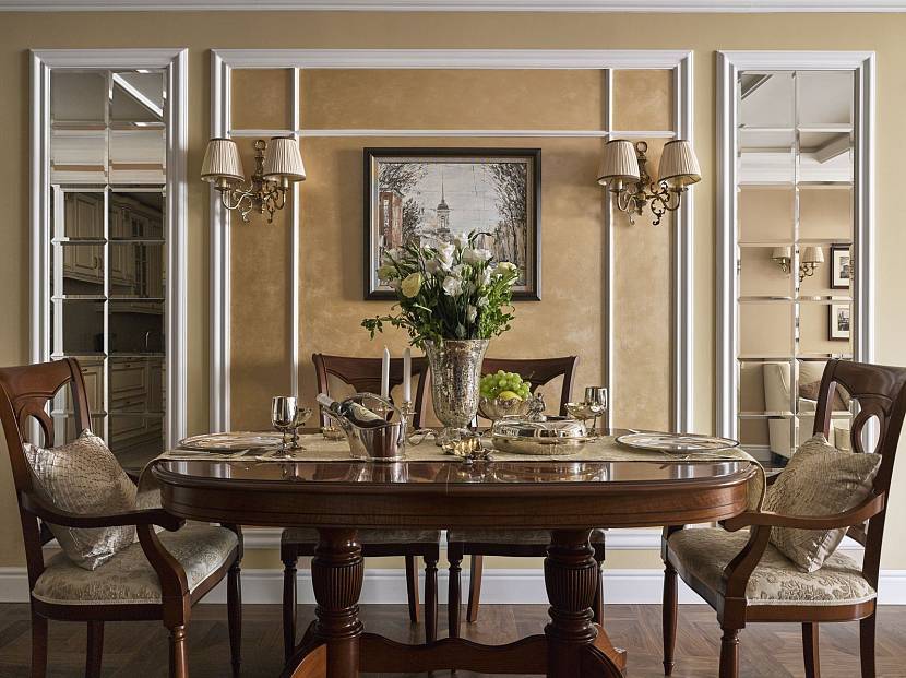 Зеркальная стена. Прием, чаще применяемый в классических и модерновых интерьерах. Фацетный декор занимает всю стену и делает ее акцентом комнаты