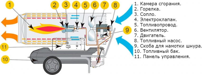 Пушки прямого нагрева – простейшие устройства, которые могут служить источниками тепла. Такие конструкции имеют открытую камеру сгорания. Внутри установлен насос, оснащенный форсункой, за счет чего обеспечивается эффект факела. Позади этих элементов размещается вентилятор. Все тепло, которое формируется в процессе переработки топлива, подается в помещение вместе с продуктами его сгорания.