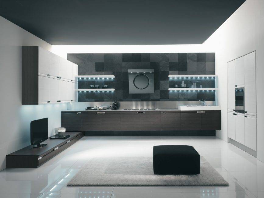 Высокотехнологичный дизайн интерьера обычно не требует дополнительных декоративных элементов, поскольку большое количество света, как правило, преломляется хромированными и глянцевыми поверхностями и отражается в зеркалах.