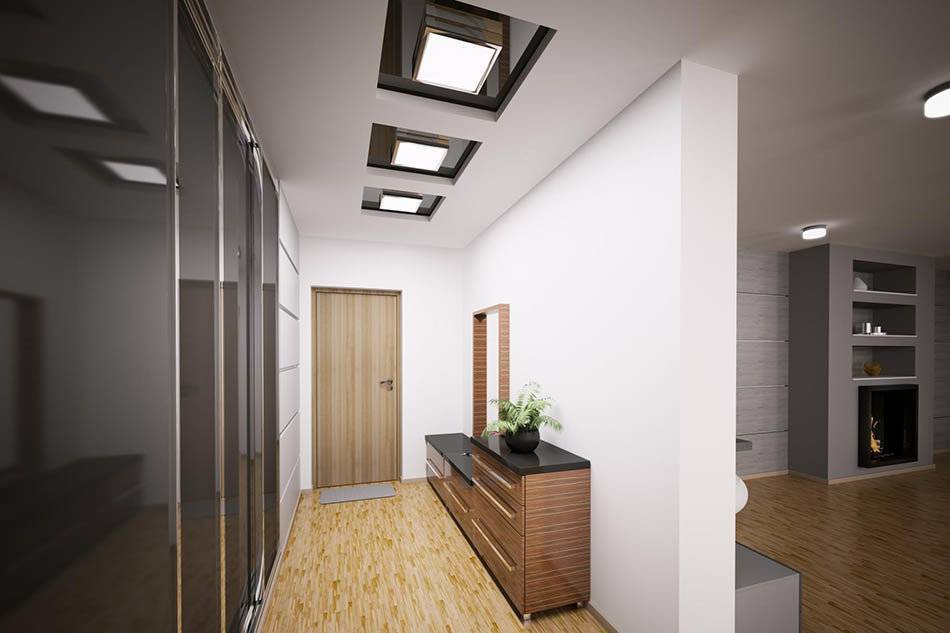 Если коридор имеет сложную конфигурацию, точечным световым источникам придается особое значение. В прихожих, отличающихся квадратной планировкой, отлично смотрятся люстры, размещенные в центральной части потолка.